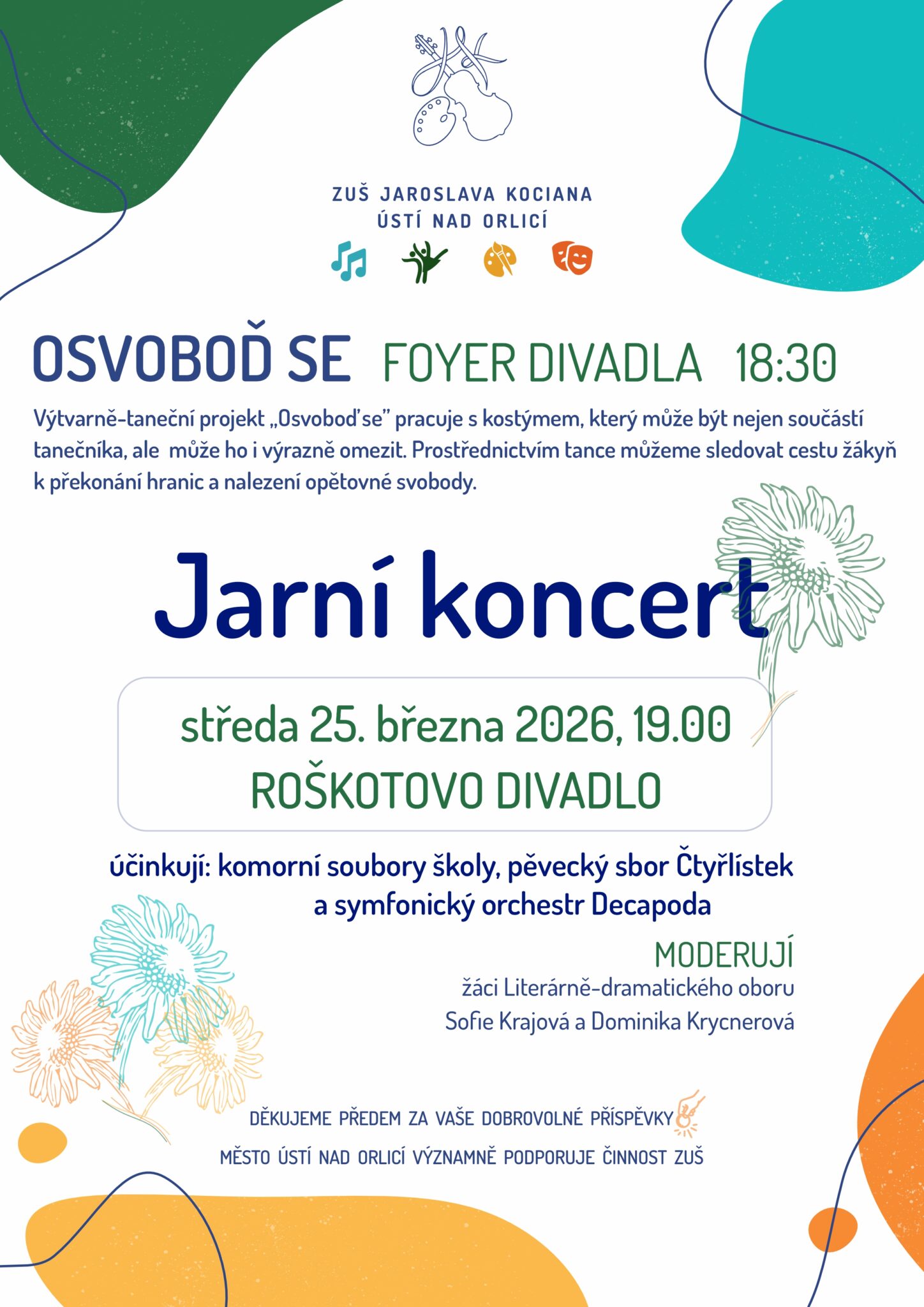 – účinkují: komorní soubory školy, pěvecký sbor Čtyřlístek a symfonický orchestr Decapoda